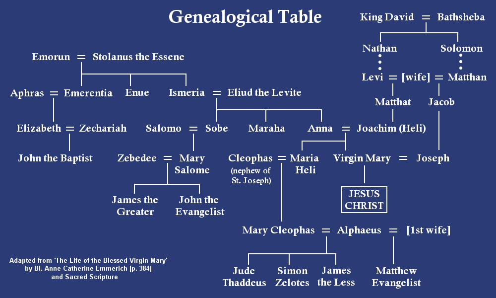 “A record of the genealogy of Jesus Christ THE SON OF DAVID, the son of Abraham: Abraham was the father of Isaac, Isaac the father of Jacob, Jacob the father of Judah and his brothers, Judah the father of Perez and Zerah, whose mother was Tamar, Perez the father of Hezron, Hezron the father of Ram, Ram the father of Amminadab, Amminadab the father of Nahshon, Nahshon the father of Salmon, Salmon the father of Boaz, whose mother was Rahab, Boaz the father of Obed, whose mother was Ruth, Obed the father of Jesse, and Jesse the father of King David. David was the father of Solomon, whose mother had been Uriah’s wife, Solomon the father of Rehoboam, Rehoboam the father of Abijah, Abijah the father of Asa, Asa the father of Jehoshaphat, Jehoshaphat the father of Jehoram, Jehoram the father of Uzziah, Uzziah the father of Jotham, Jotham the father of Ahaz, Ahaz the father of Hezekiah, Hezekiah the father of Manasseh, Manasseh the father of Amon, Amon the father of Josiah, and Josiah the father of Jeconiah and his brothers at the time of the exile to Babylon. After the exile to Babylon: Jeconiah was the father of Shealtiel, Shealtiel the father of Zerubbabel, Zerubbabel the father of Abiud, Abiud the father of Eliakim, Eliakim the father of Azor, Azor the father of Zadok, Zadok the father of Akim, Akim the father of Eliud, Eliud the father of Eleazar, Eleazar the father of Matthan, Matthan the father of Jacob, and Jacob the father of Joseph, the husband of Mary, of whom was born Jesus, who is called Christ. Thus there were fourteen generations in all from Abraham to David, fourteen from David to the exile to Babylon, and fourteen from the exile to the Christ. This is how the birth of Jesus Christ came about: His mother Mary was pledged to be married to Joseph, but before they came together, she was found to be with child through the Holy Spirit. Because Joseph her husband was a righteous man and did not want to expose her to public disgrace, he had in mind to divorce her quietly. But after he had considered this, an angel of the Lord appeared to him in a dream and said, ‘Joseph SON OF DAVID, do not be afraid to take Mary home as your wife, because what is conceived in her is from the Holy Spirit.’” Matthew 1:1-20